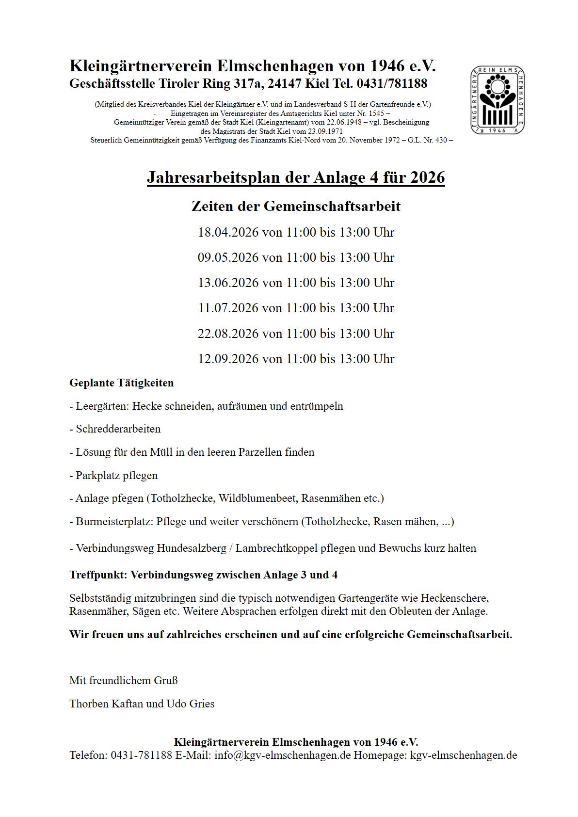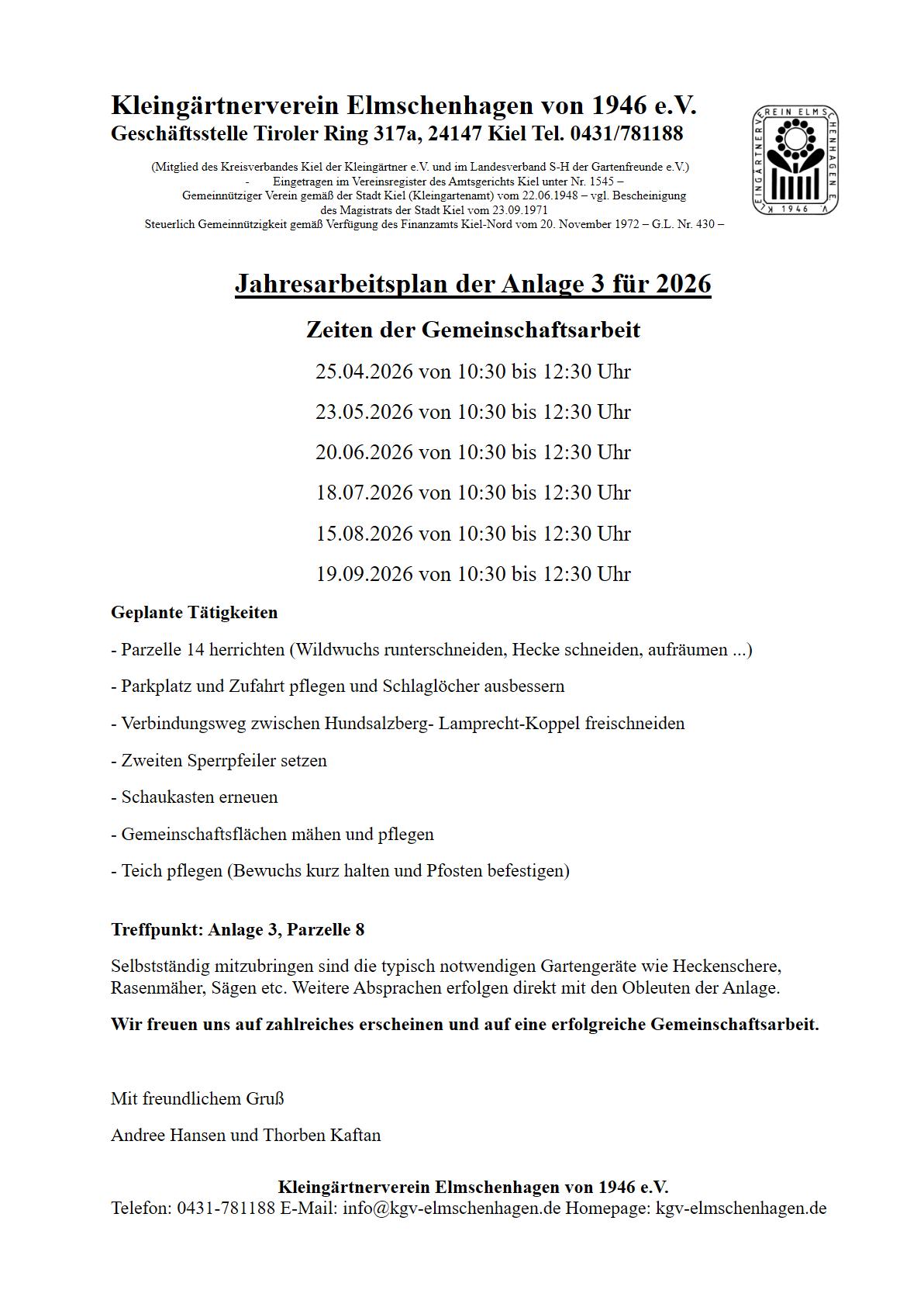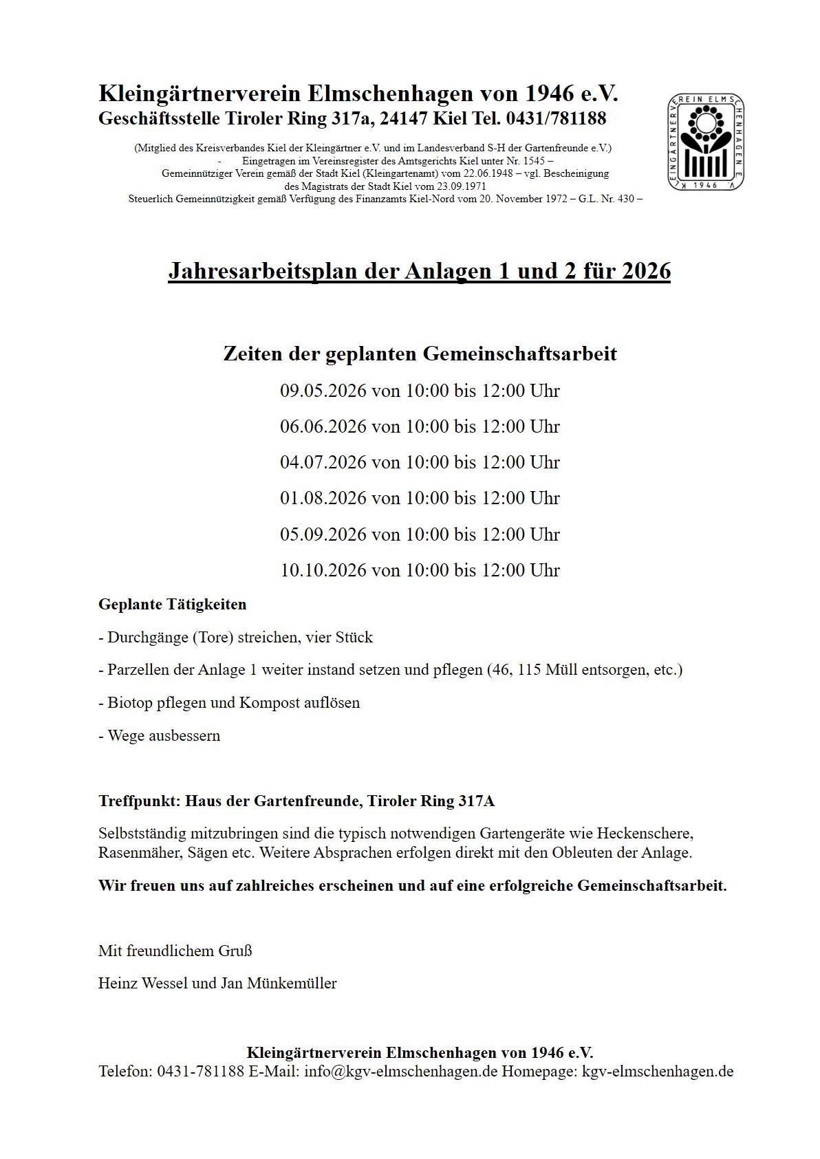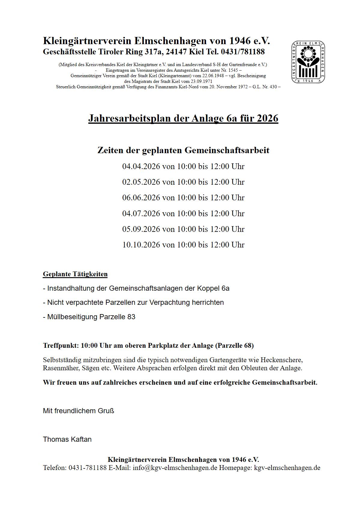 anbei alle Jahresarbeitspläne, inklusive der Zeiten für die Gemeinschaftsarbeit, im Jahre 2026. Kurzfristige Änderungen sind, zum Beispiel durch die Witterung, möglich. Wendet Euch bei Fragen an die Obleute und verfolgt regelmäßig unsere Homepage und die Social-Media-Kanäle.
