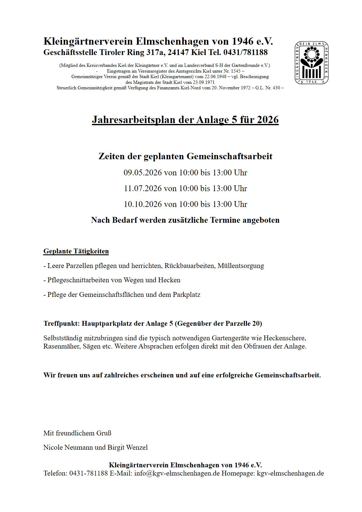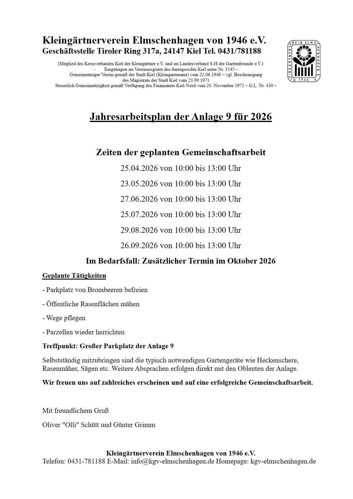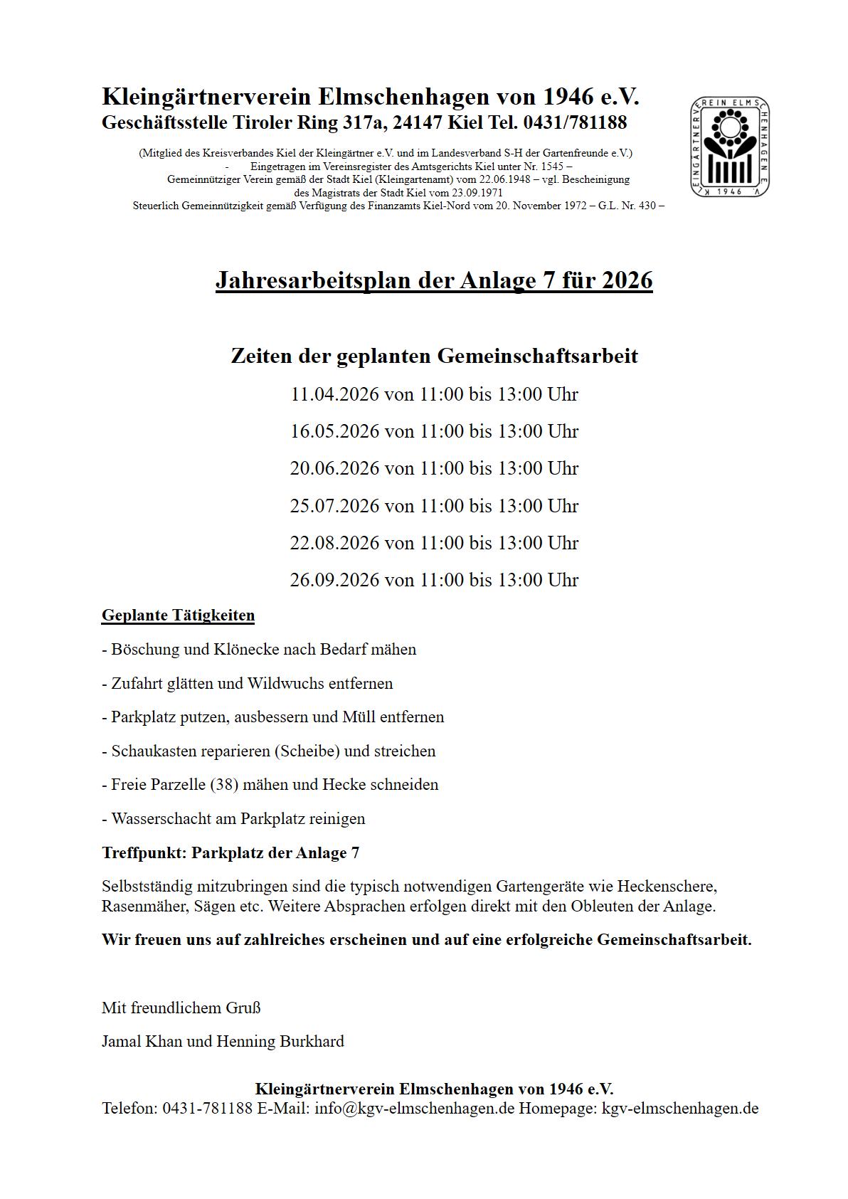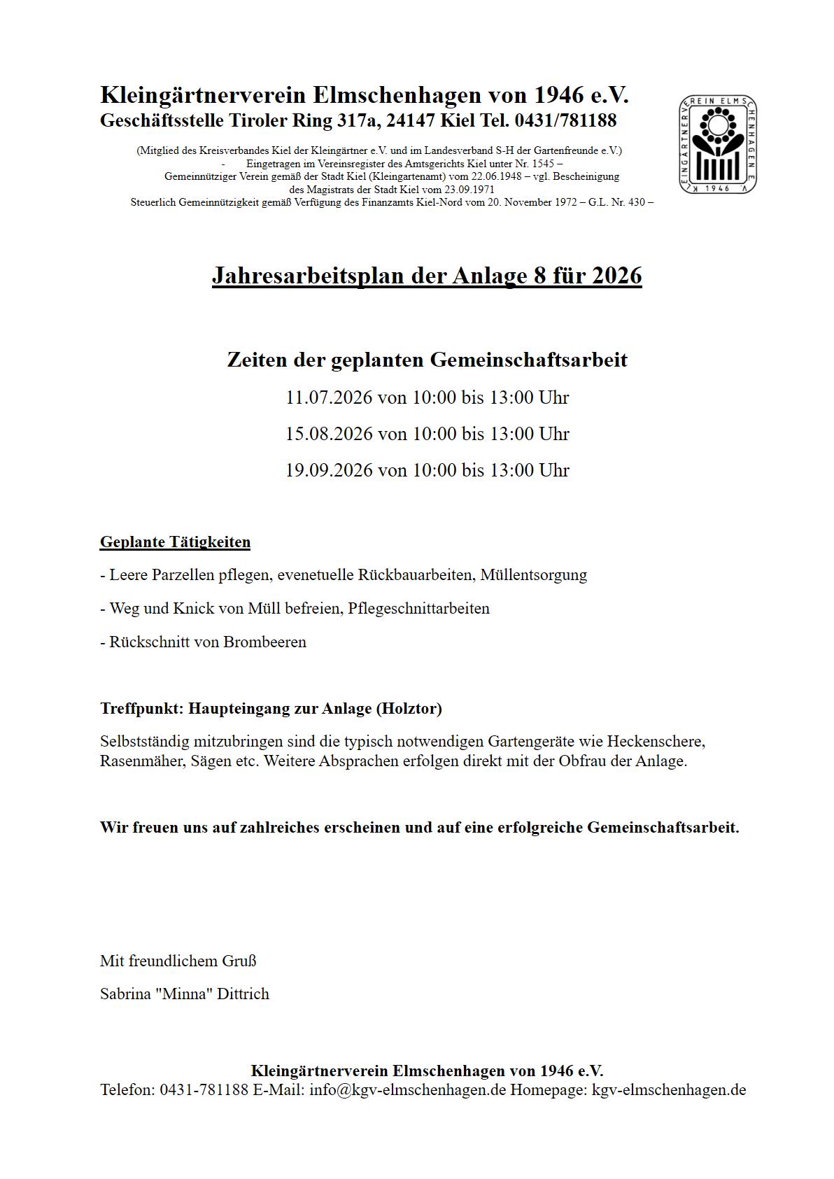 anbei alle Jahresarbeitspläne, inklusive der Zeiten für die Gemeinschaftsarbeit, im Jahre 2026. Kurzfristige Änderungen sind, zum Beispiel durch die Witterung, möglich. Wendet Euch bei Fragen an die Obleute und verfolgt regelmäßig unsere Homepage und die Social-Media-Kanäle.