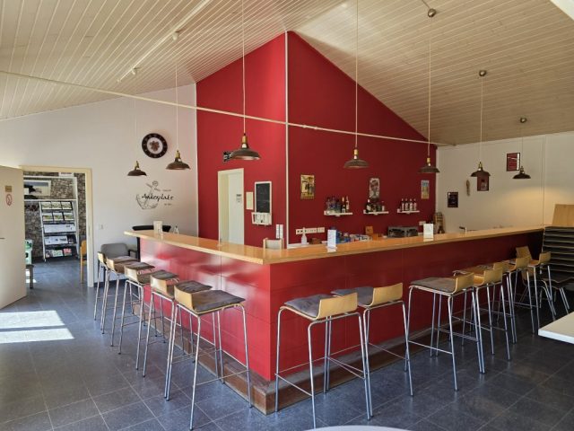 Der Tresenbereich bietet rein optisch ein tolles Zusammenspiel zwischen rustikalem Holz und rot/weißen Malerarbeiten. Eine mobile massive Holz-Trennwand separiert optional den Tresen von dem Festsaal. Die Gestaltung bietet eine Fusion aus Industriestil und klassischem Bardesign.