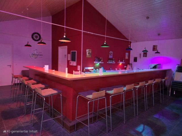Die Ausstattung bietet zwei Kühlschränke, Gläser fast aller Art, eine vielseitige Möglichkeit an Lichtgestaltung („Govee“-Systembeleuchtung) und einige Sitz- und diverse Stehmöglichkeiten.